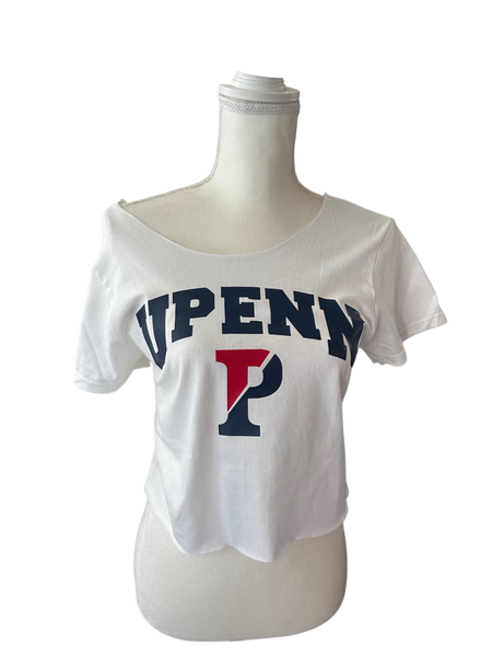 100% Cotton. Women's fit tee. Cropped above the belly button with raw neckline and hem.