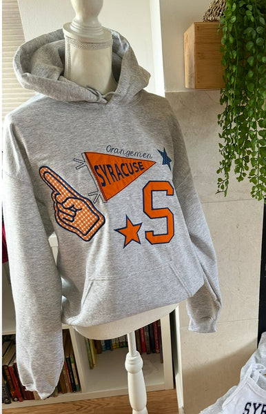 This item is a soft, fleece-lined hoodie.Each hoodie is customized with your custom text and a collection of appliqués as seen on the sweater. The mannequin wears a size large.